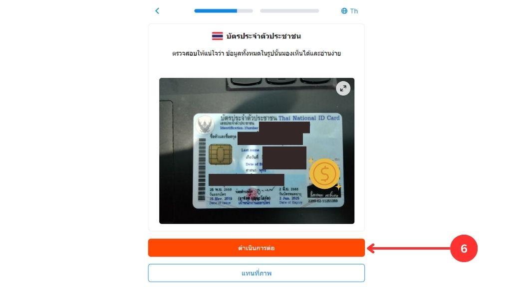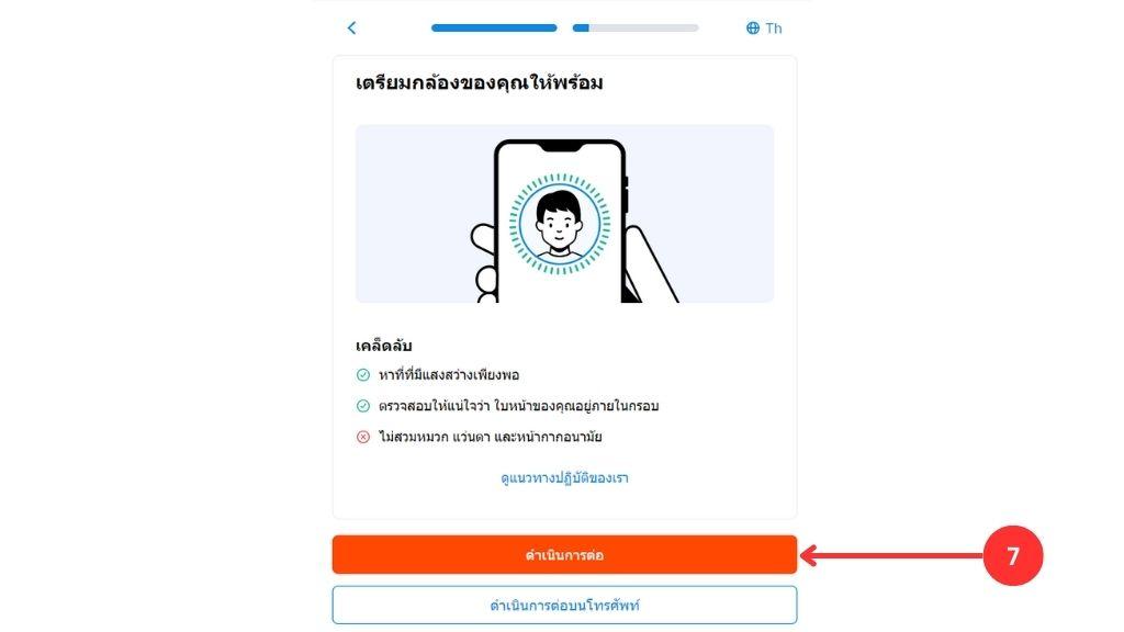 - เตรียมกล้องหน้า เพราะจะต้องยืนยันใบหน้าบุคคลด้วย กด “ดำเนินการต่อ”
