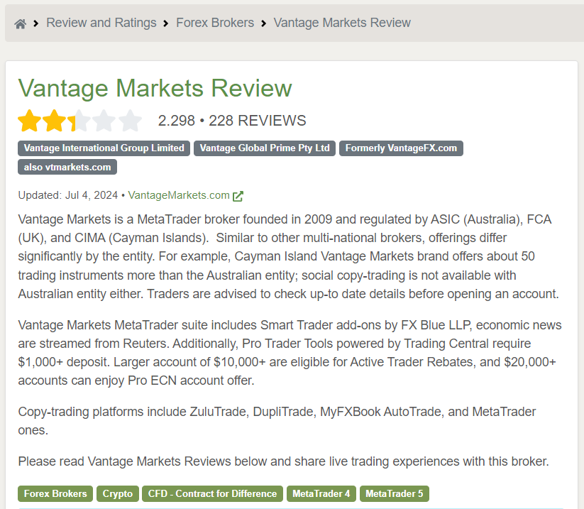 Vantage เป็นโบรกเกอร์ฟอเร็กซ์และ CFD ที่ก่อตั้งในปี 2009 ให้บริการซื้อขายสินทรัพย์หลายประเภท เช่น ฟอเร็กซ์ สินค้าโภคภัณฑ์ ดัชนี และคริปโตเคอร์เรนซี มีแพลตฟอร์มการซื้อขายหลากหลายรวมถึง MetaTrader 4 และ 5 และแอปพลิเคชันมือถือ Vantage มีการควบคุมโดยหน่วยงานการเงินหลายแห่ง รวมถึง ASIC และ FCA บัญชีซื้อขายมีหลายประเภทเพื่อตอบสนองความต้องการของนักลงทุนทุกระดับ มีการสนับสนุนลูกค้าตลอด 24 ชั่วโมง 7 วัน ในส่วนของเลเวอเรจ ทุกประเภทบัญชี จะให้เริ่มต้นที่ 1:500 แต่สามารถเปลี่ยนได้ เป็น 1:1000 ยกเว้น บัญชีพรีเมี่ยม ที่สามารถปรับได้สูงสุด 1:2000 แต่เงินฝากขั้นต่ำค่อนข้างสูง เมื่อเทียบกับบัญชีและโบรกเกอร์อื่นๆ